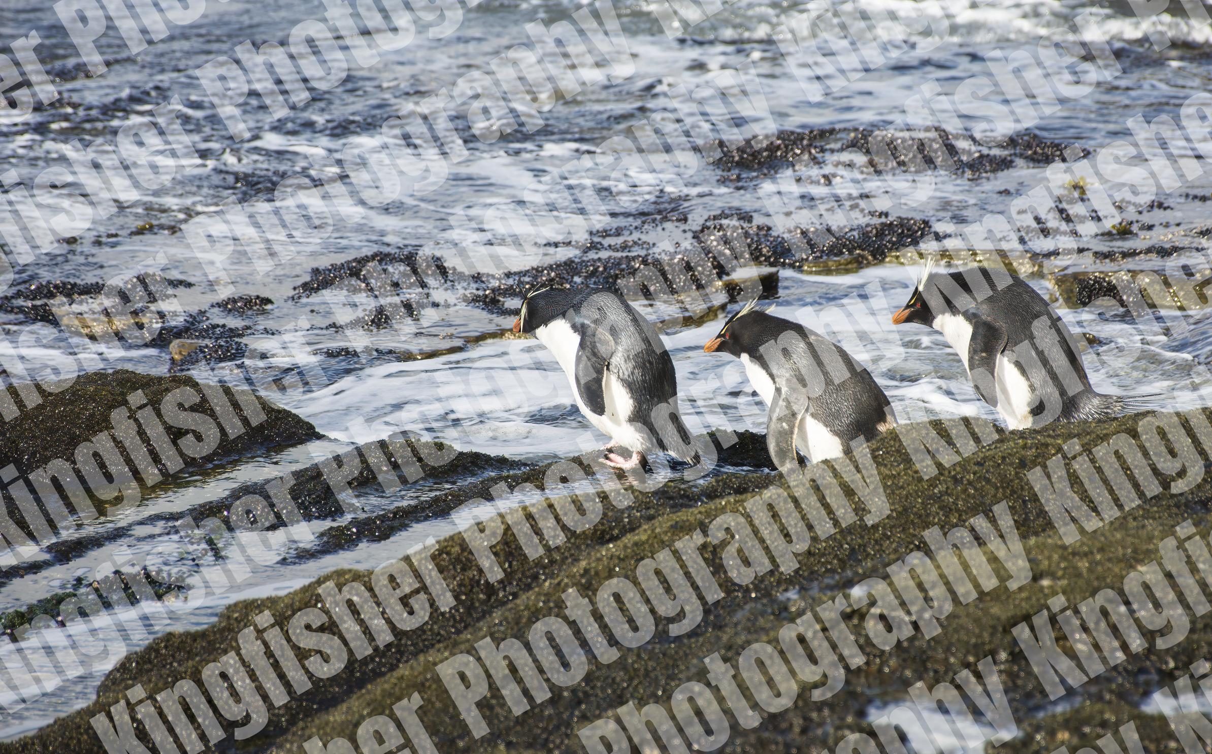 Three rockhopper penguins on the way to the sea on Saunders Island, Falkland Islands