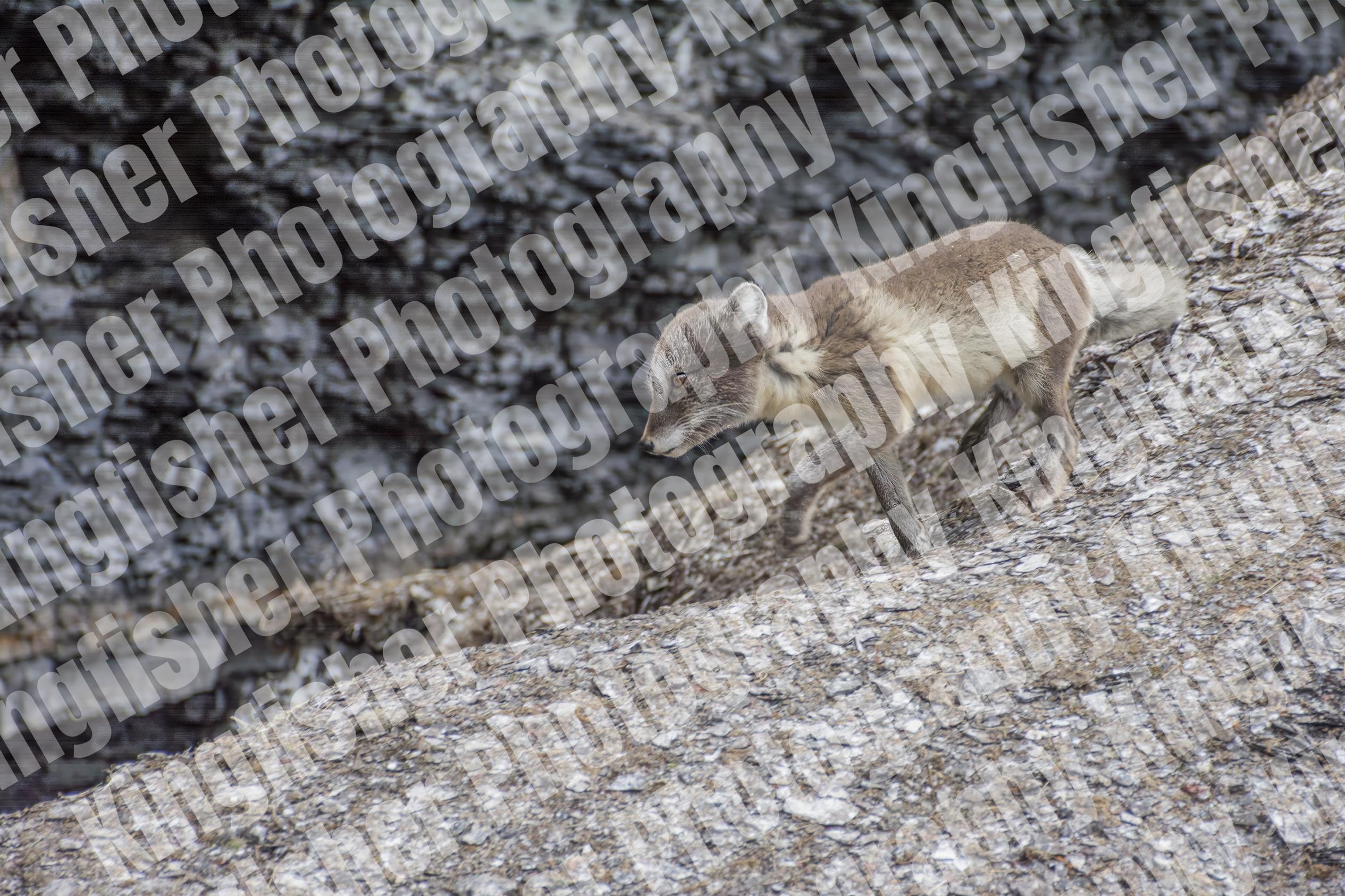 Polar fox under a bird cliff on Barents Island, Svalbard