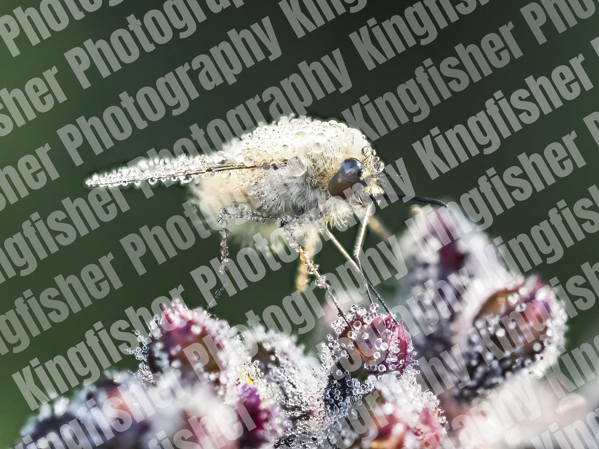 Grasshopper bee fly (Systoechus vulgaris) with dewdrops in the early morning within the heathland Kissinger Heide, Germany